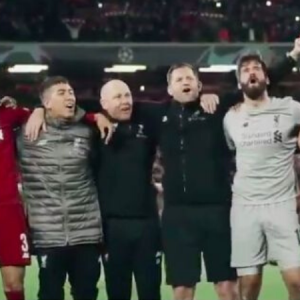 Video showing Fabinho emotionally belting the YNWA song after beating Barca 4-0 has emerged