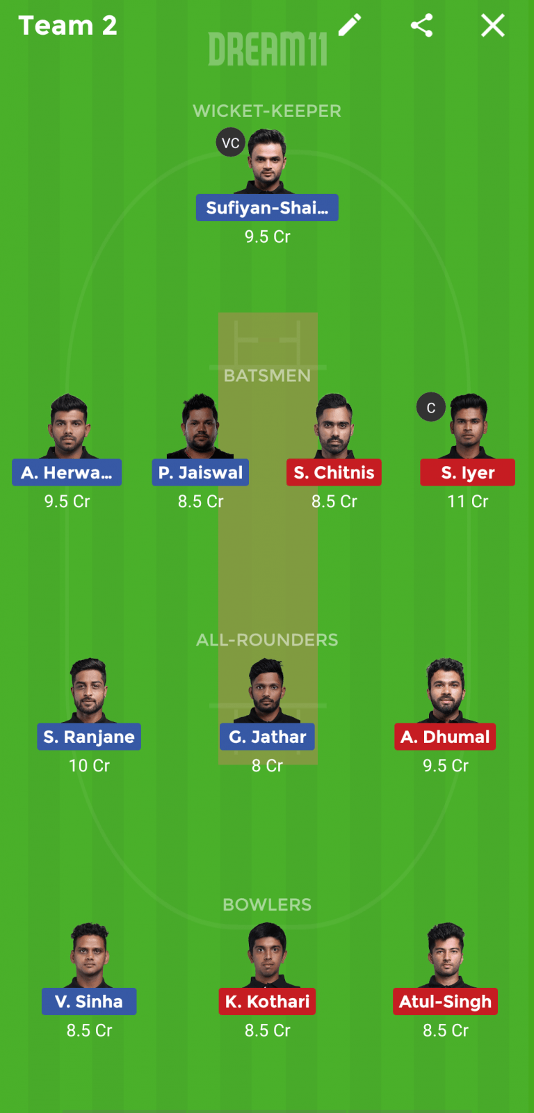 Akhil Harwadkar is my next batsman. He opens the batting and looked in good form in the last match. Expect him to score a big one tonight. Pankaj Jaiswal also makes my team on the back of a solid performance in the middle order last night. Jaiswal looked dependable and should get us some crucial points.