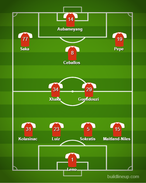 Arsenal: Bernd Leno, Ainsley Maitland Niles, Sokratis, David Luiz, Sead Kolasinac, Granit Xhaka, Matteo Guendouzi, Dani Ceballos, Nicolas Pepe, Bukayo Saka, Pierre Emerick Aubameyang.