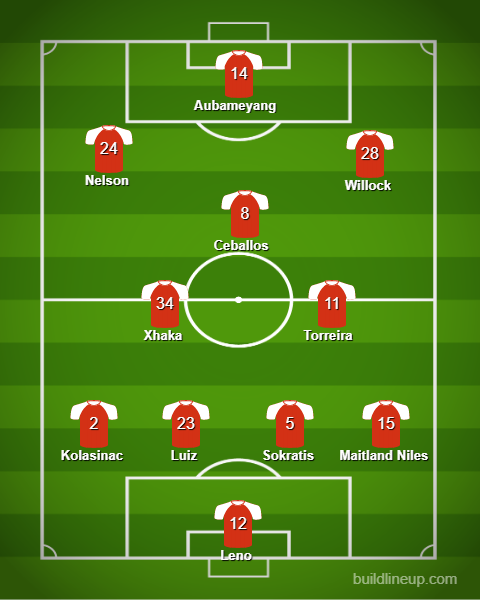 Arsenal: Bernd Leno, Ainsley Maitland Niles, Sokratis Papastathopoulos, David Luiz, Sead Kolasinac, Granit Xhaka, Lucas Torreira, Dani Ceballos, Joe Willock, Reiss Nelson, Pierre Emerick Aubameyang.