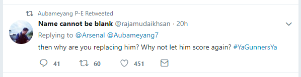 He retweeted a reply which stated that Aubameyang should’ve been on the field for full-90 minutes.