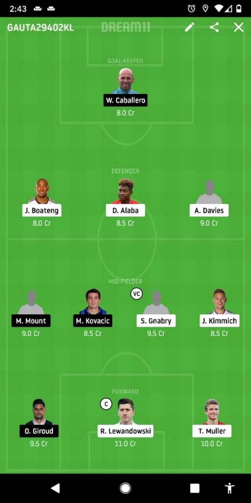 Willy, Boateng, Davies, Alaba, Kimmich, Gnabry, Kovacic, Mount, Giroud, Robert, Muller