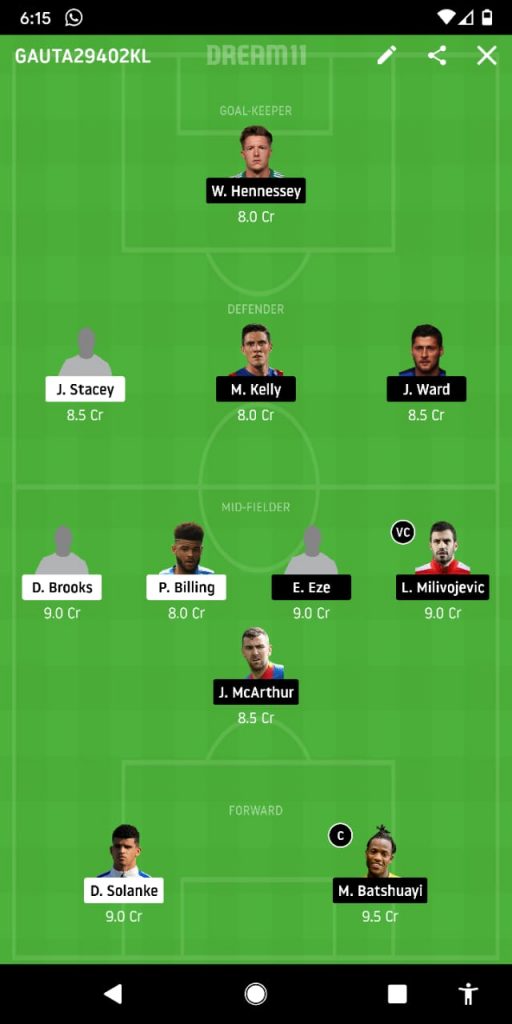 Hennessey, Ward, Kelly, Woods, Mitchell, McArthur, Milivojevic, Eze, Meyer, Schlupp, Batshuayi