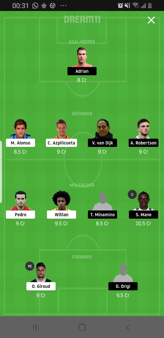 Andrew Robertson comes into our side as well owing to his akin attacking penchant while after his two goal show against Bournemouth to help Chelsea salvage a draw from the tie, Marcos Alonso is our pick from the home side.