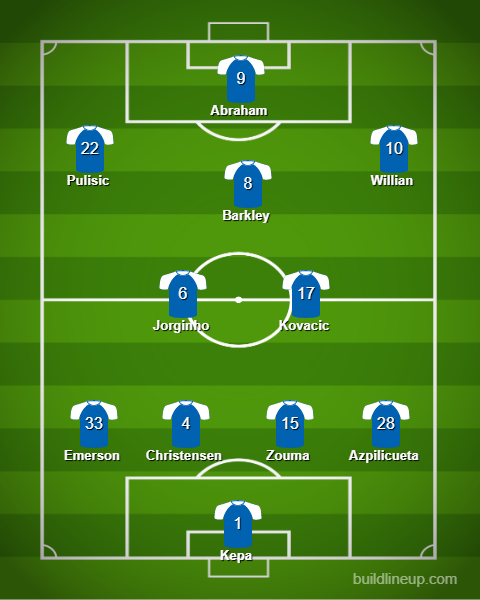 Chelsea: Kepa Arrizabalaga, Cesar Azpilicueta, Andreas Christensen, Kurt Zouma, Emerson Palmieri, Jorginho, Mateo Kovacic, Ross Barkley, Willian, Christian Pulisic, Tammy Abraham.