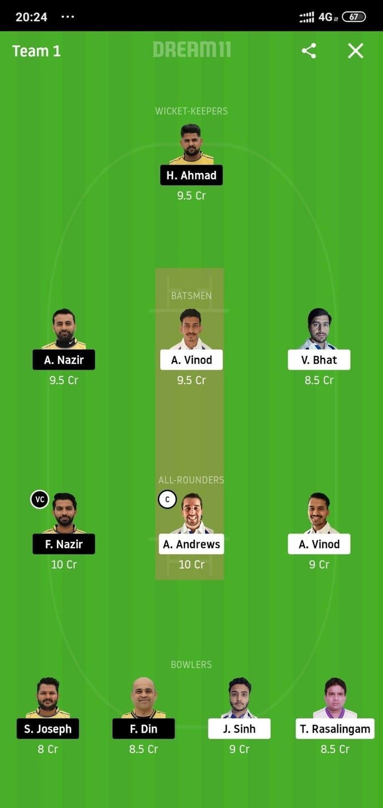 Andrews will open the innings for his side whereas Vinod will bat at number 3. Andrews has picked 4 wickets till now whereas Vinod has picked 3. Both of them should be picked in the team.