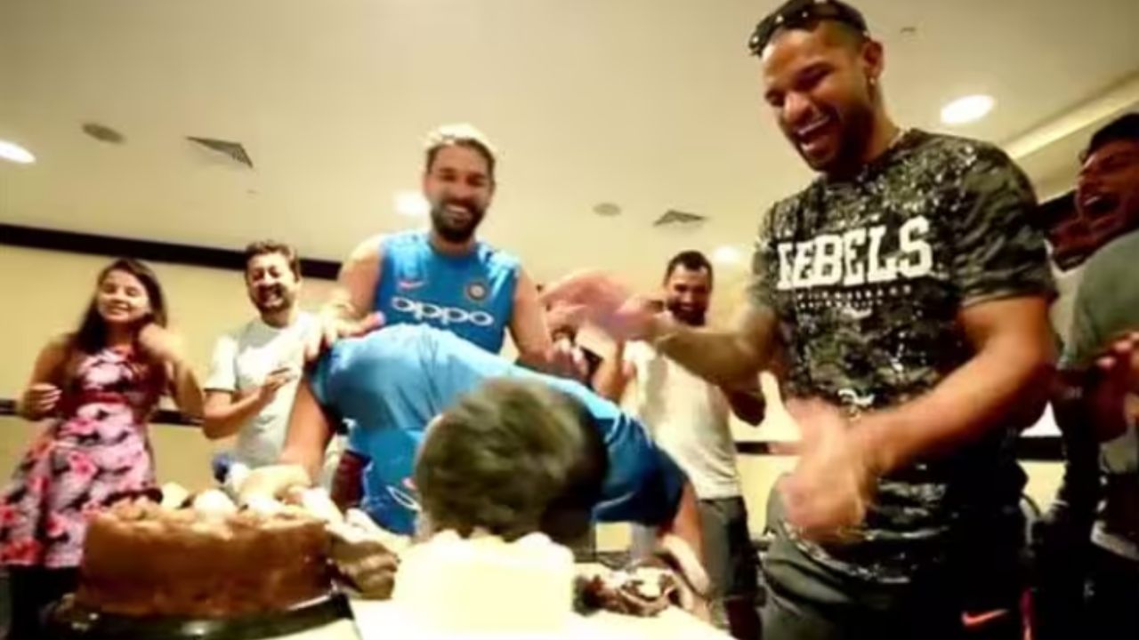 Surrounding him were the likes of Shikhar Dhawan, Virat Kohli, Yuvraj Singh etc., all of whom were waiting in anticipation to have some fun with the birthday boy, only to find themselves off-guard a few seconds later.