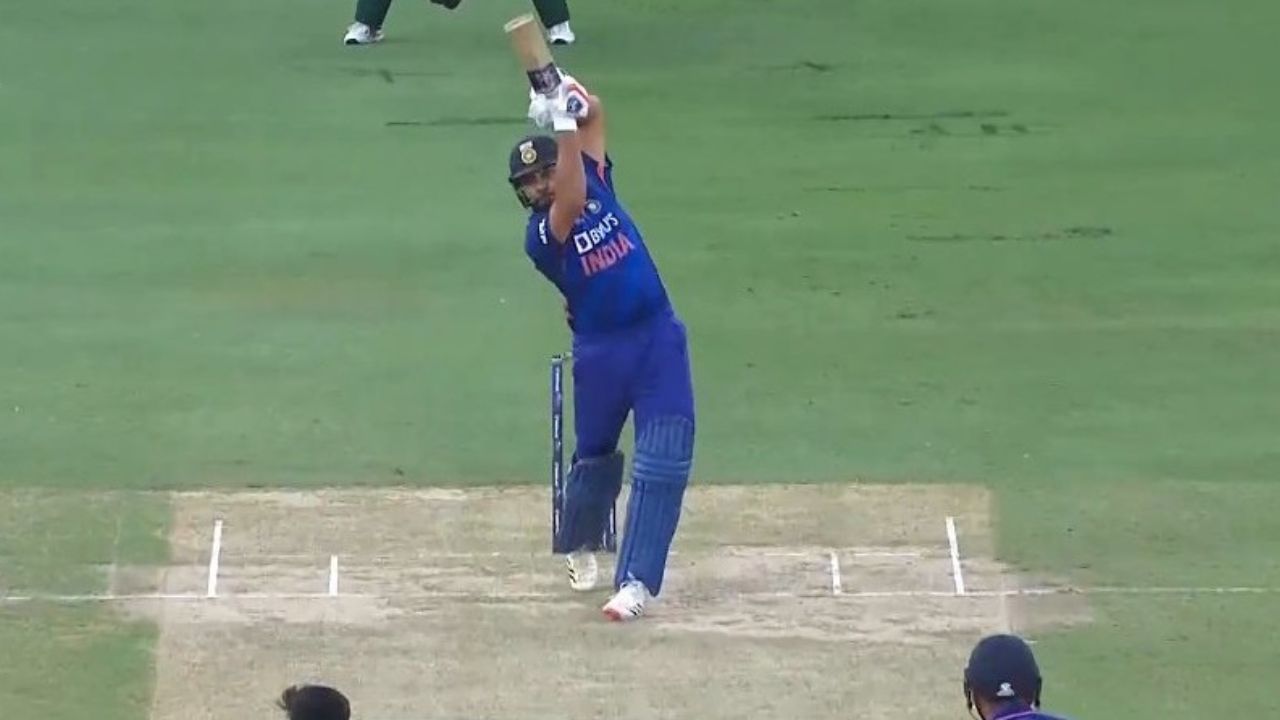 Having left the first ball that he faced off Pakistan fast bowler Naseem Shah, Sharma danced down the track on the following delivery to hit Shah for a boundary over cover. On the last delivery of the same over, Sharma played another lofted shot hitting the right-arm bowler over mid-wicket for a massive six.