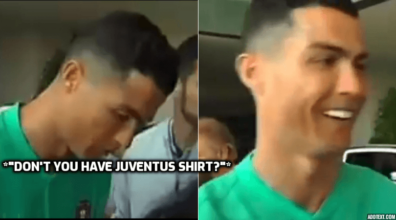 When he went near the fan to sign the jersey, Ronaldo jokingly asked ” No Tienes Camiseta de la Juventus?” which translates to “Don’t you have Juventus shirt?”