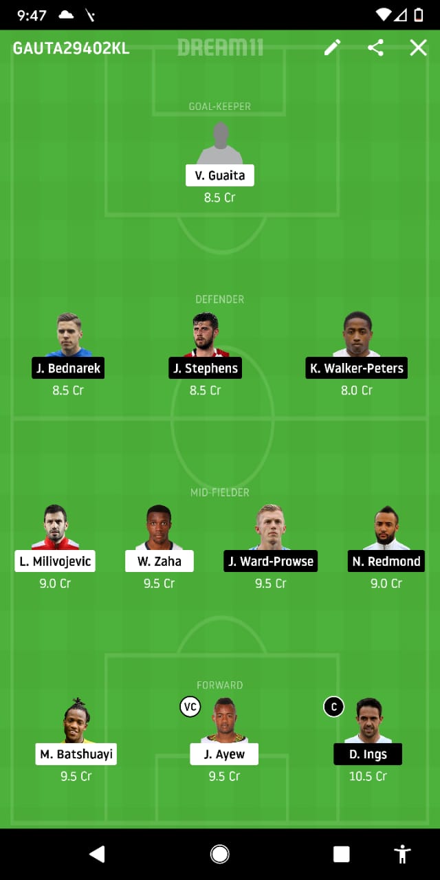 Guaita, Ward, Kelly, Dann, Mitchell, Zaha, Milivojevic, McArthur, Schlupp, Batshuayi, Ayew