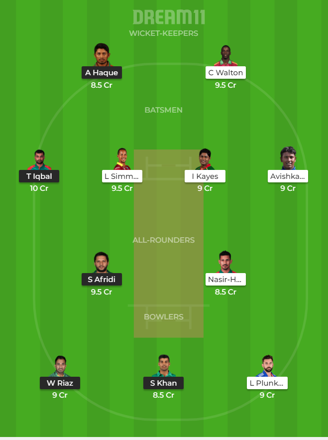 Lendl Simmons, Avishka Fernando, Imrul Kayes (c), Nasir Hossain, Chadwick Walton, Nurul Hasan (wk), Muktar Ali, Liam Plunkett, Rubel Hossain, Nasum Ahmed, Mehedi Hasan Rana