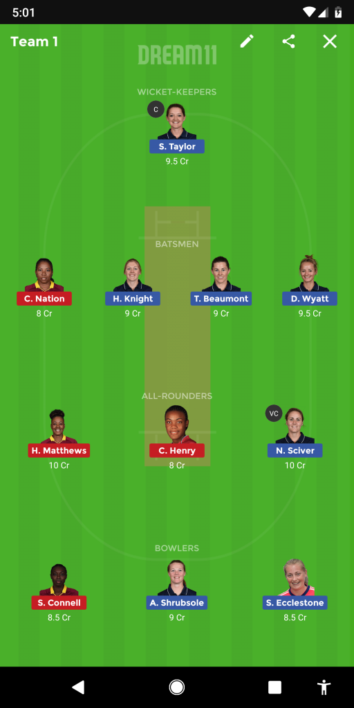 England Vs West Indies Women First T20I Best Dream 11 Team