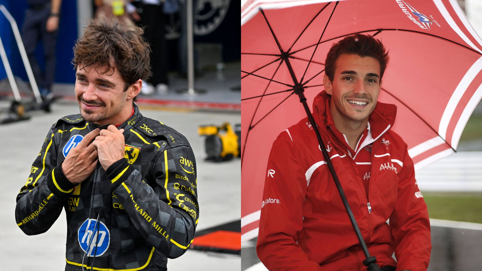charles posing with both of his teams!! the pro driver’s team will have isaak hadjar, giuliano alesi, tommy bianchi, and many more, while LC8 is just with his friends ❤️❤️ https://t.co/krysOXejAZ pic.twitter.com/W6O63TCyps