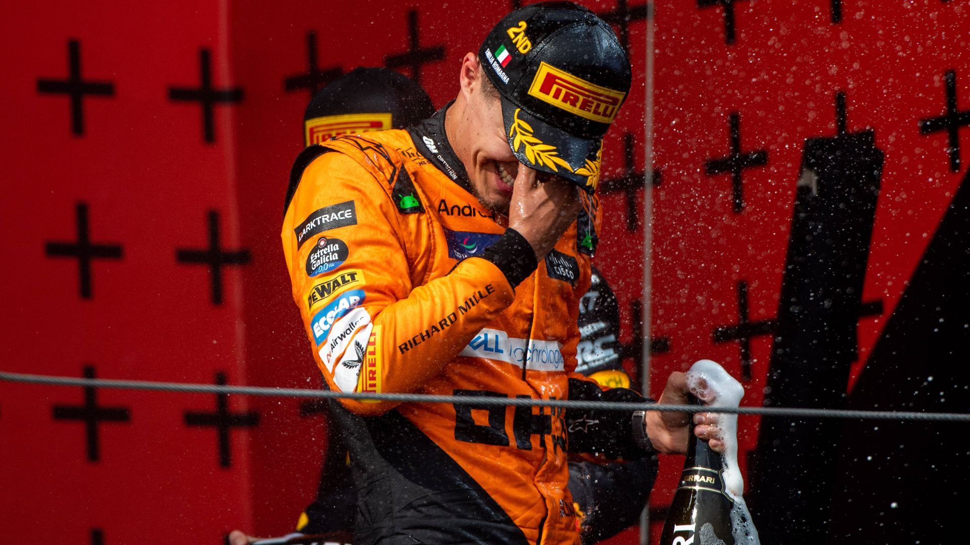 Whenever on the podium, the #4 driver can be seen ‘popping’ the bottle by slamming it on the ground. The early iterations of this sometimes turned to disaster — most infamously when he unintentionally broke Max Verstappen’s 2023 Hungarian GP winner’s trophy.