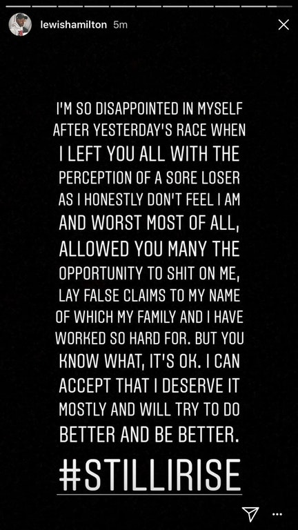 Hamilton had accepted the apology and was ready to move on. He, however, came up with another social media statement after that, wherein he wanted to admit that his behaviour did seem like one of a sore loser, but he was determined to come back stronger in the next grand prix.