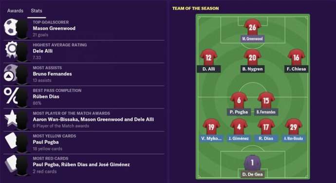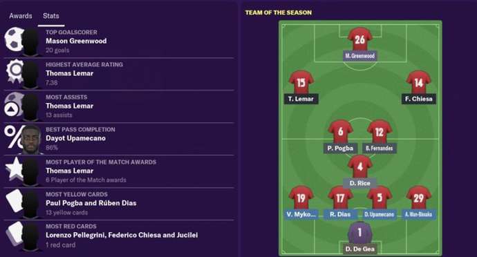 Manchester United end out of the top 4 for the first time this decade. Although, new signing Lemar impresses with the most assists. Highest goal scorer, Greenwood has now become one of Europe’s best striker. With the team reverting to a 4-3-3, Rice finds a place in the team as a defensive midfielder.