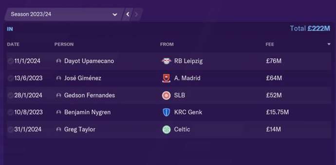 Jurgen Klopp is shockingly replaced by former Borussia Dortmund boss Lucien Favre. Favre also spends massively and brings in Dayot Upamecano, Jose Gimenez, Gedson Fernandes, Benjamin Nygren and Greg Taylor for a total of £224 million.