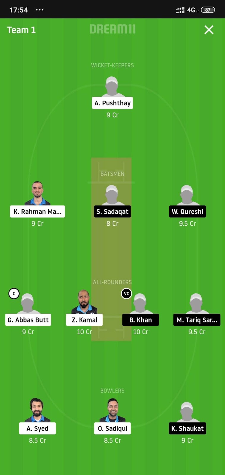 O Sadiqui (Price 8.5) and A Syed (Price 8.5) will be our bowlers from the Helsinki side and will complete our squad. Sadiqui has been in a very good form for his team and has picked 4 wickets so far in the tournament whereas Syed is a very experienced player and he will also be a good player to have in the side.