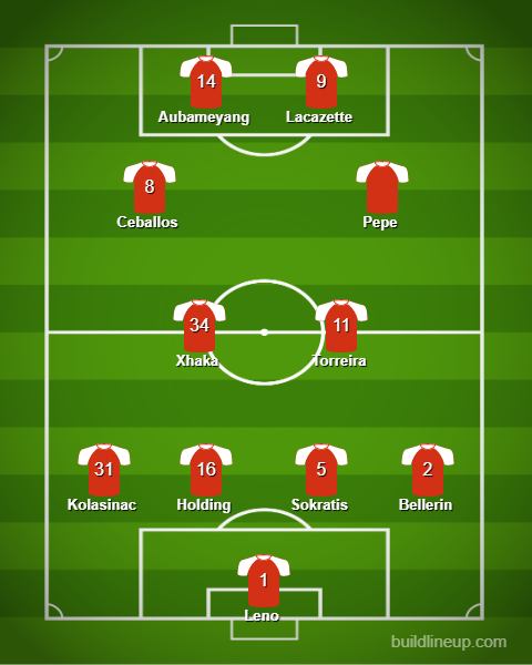 XI: Bernd Leno, Hector Bellerin, Sokratis Papastathopoulos, Rob Holding, Sead Kolasinac, Granit Xhaka, Lucas Torreira, Dani Ceballos, Nicolas Pepe, Pierre Emerick-Aubameyang, Alexandre Lacazette.