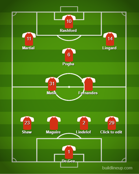 XI: David De Gea, Aaron Wan-Bissaka, Victor Lindelof, Harry Maguire, Luke Shaw, Nemanja Matic, Bruno Fernandes, Paul Pogba, Jesse Lingard, Anthony Martial, Marcus Rashford.