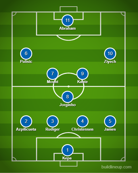 Tammy Abraham leads the attack while Mason Mount plays right behind him. Christian Pulisic plays on the left while new recruit Hakim Ziyech operates on the right wing.