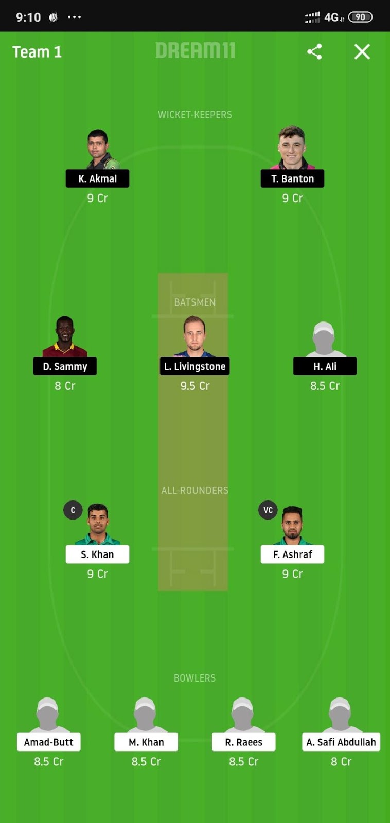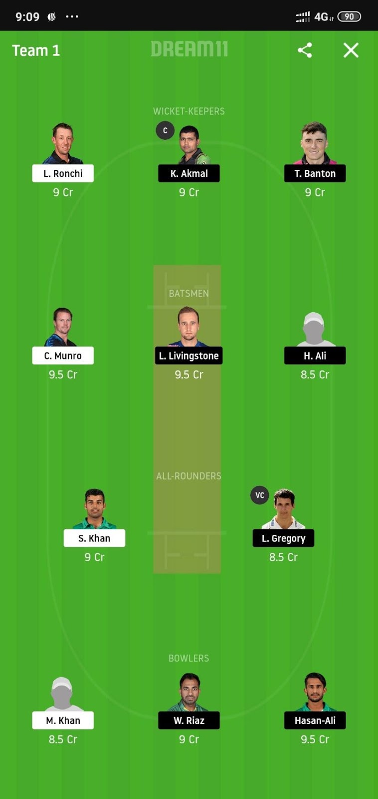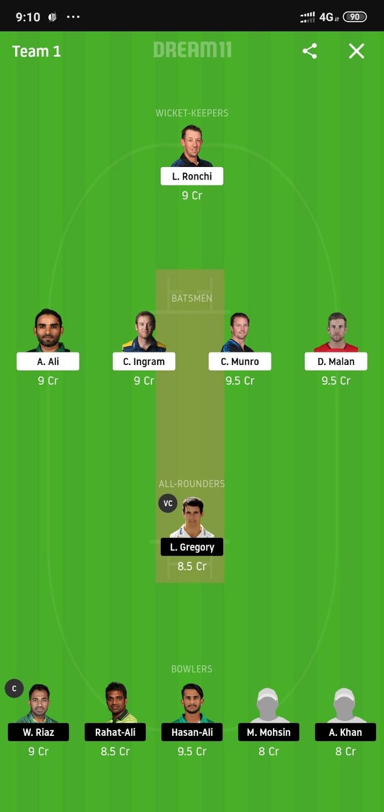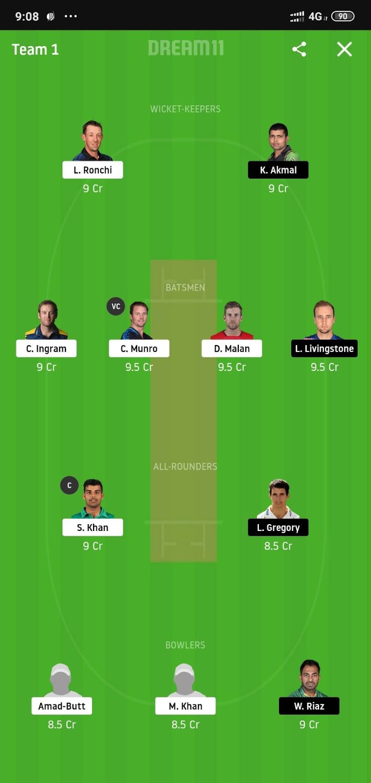 Lewis Gregory (Price 8.5) and Shadab Khan (Price 9) will be our all-rounders. Shadab is currently batting at number 4 and is playing some serious knocks with the bat and there is no doubt over his bowling ability whereas Gregory won the MOTM award in his debut game only and would like to build upon that.