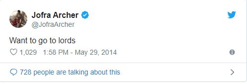 Here are the set of Jofra Archer’s tweets ranging from the year 2013 to 2018 that find uncanny resemblance in England’s journey from the semi-finals vs Australia to playing the finals at the iconic Lord’s Cricket Ground.