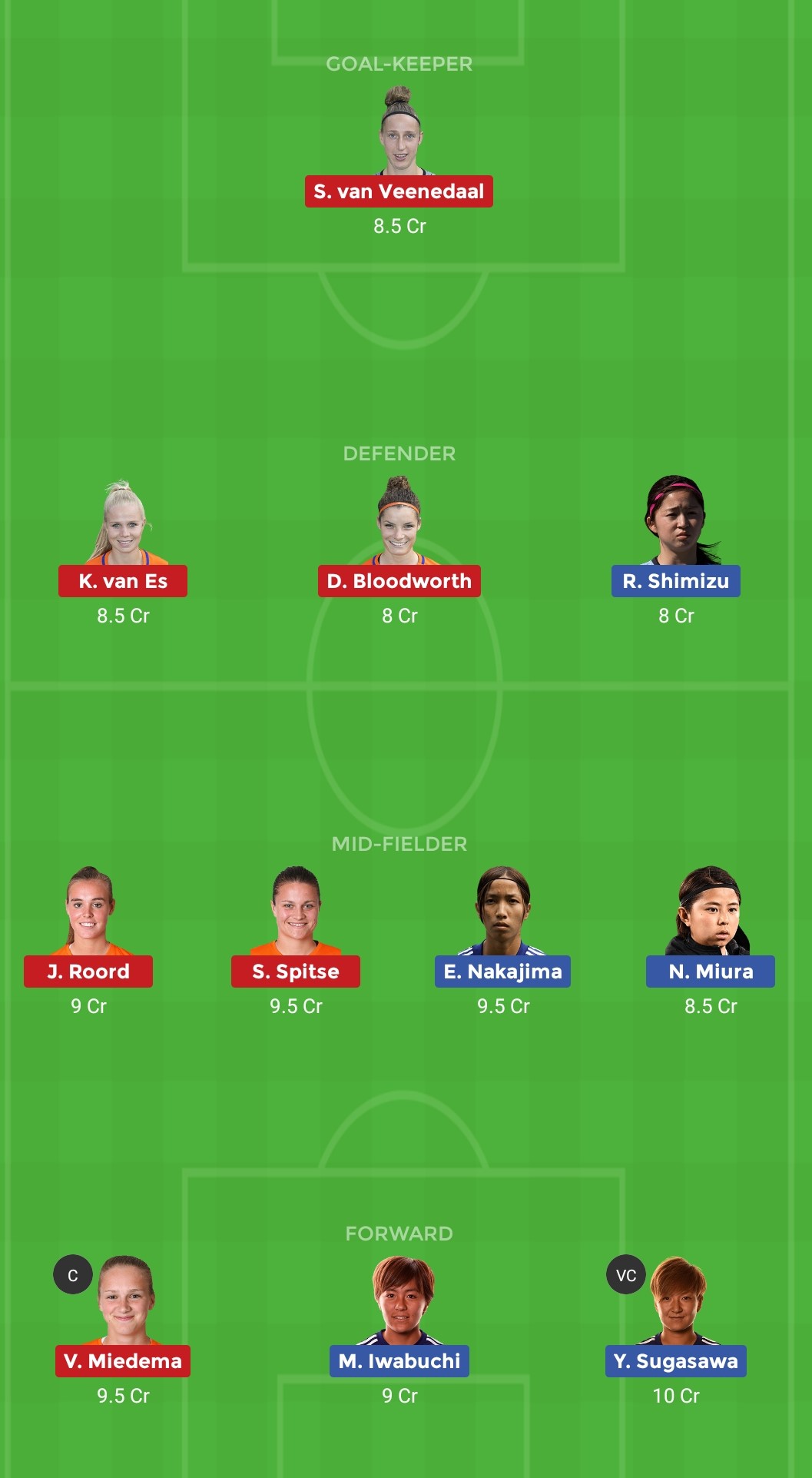 Sari van Veenendaal: The Dutch goalkeeper and captain has as many clean sheets as her Japanese comparative. However, Sari is the safer bet in this tie in this match. Agile, tall and quick to catch crosses, the Arsenal goalkeeper is my first choice.