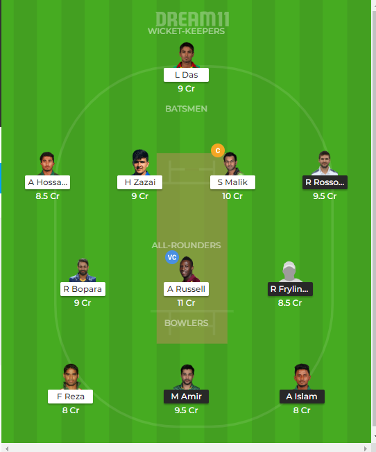 Hazratullah Zazai, Liton Das (wk), Afif Hossain Dhrubo, Shoaib Malik, Andre Russell(C), Ravi Bopara, Alok Kapali, Abu Jayed Rahi, Taijul Islam, Farhad Reza, Kamrul Islam