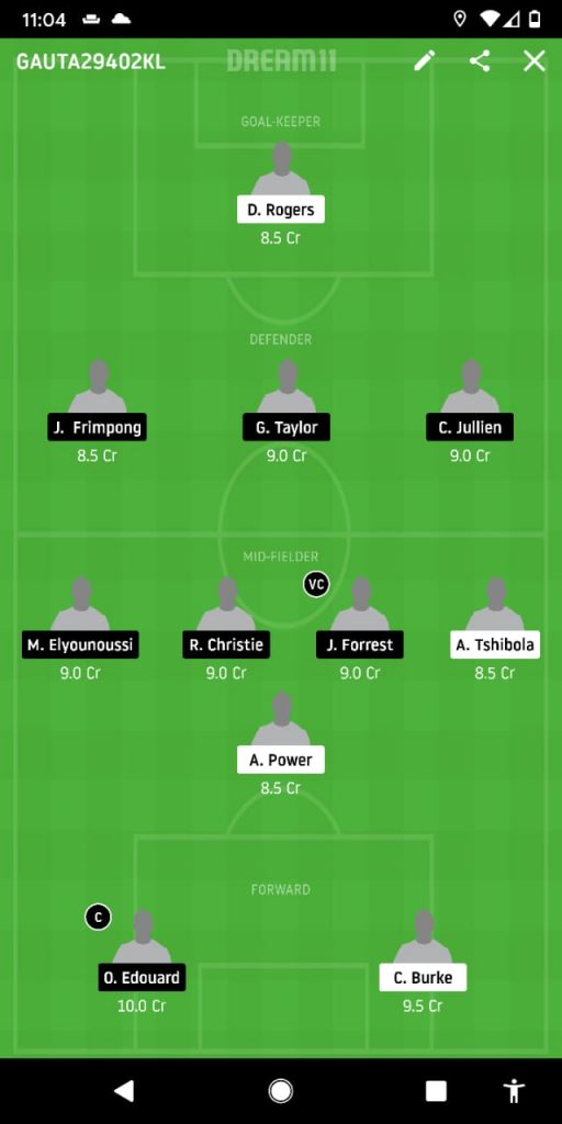 Rogers, Frimpong, Taylor, Jullien, Forrest, Christie, Mohamed, Tshibola, Power, Edouard, Burke