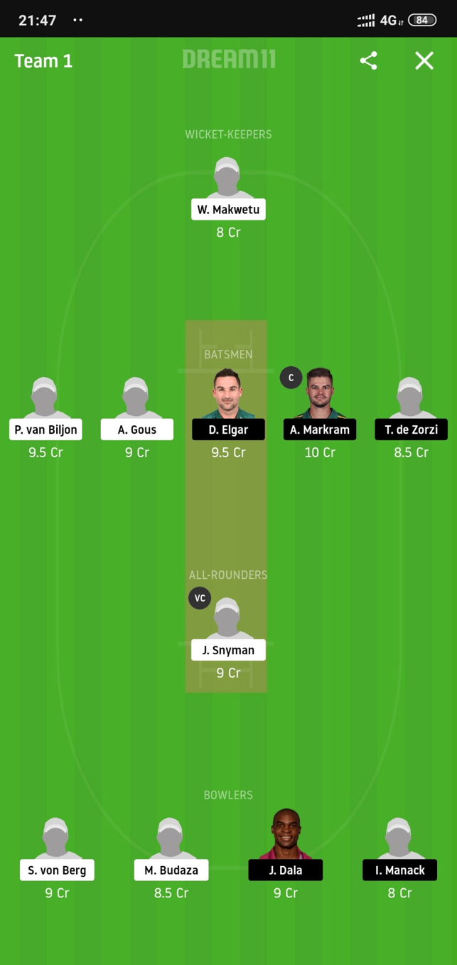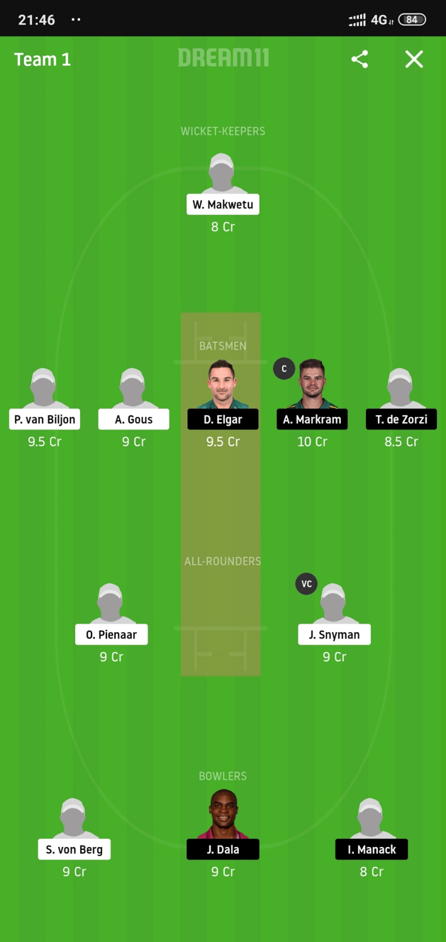 J.Snyman (Price 9) and O.Pienaar (Price 8.5) will be our all-rounders from. Snyman has been in absolute brilliant form with the bat and will be looking to continue his form in this game too whereas Pienaar is a very decent lower-order batsman and can be a good part-time bowler too.