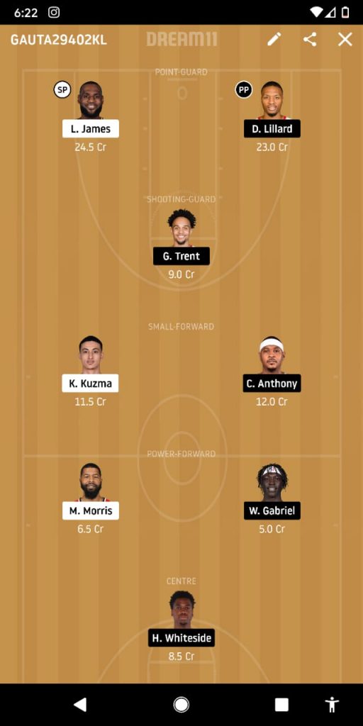 James, Lillard, Trent, Kuzma, Anthony, Morris, Gabriel, Whiteside