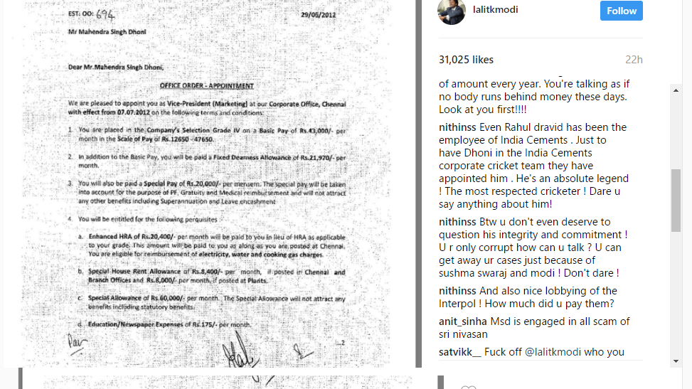 “It seems only in #india#contempt after contempt continues by the #old #guards of @bcci – How ? My best guess is #northblock. But most #puzzling is this #employment #contract of #MSD – WHY ? he earns 100’s of crores a year will he #agree to be #SRINI’S #employee. bet there are many such contracts,” Modi wrote on his Instagram post along with the copy of the contract letter.