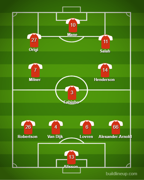 Liverpool: Alisson Becker, Trent Alexander-Arnold, Dejan Lovren, Virgil Van Dijk, Andy Robertson, Fabinho, James Milner, Jordan Henderson, Mohamed Salah, Sadio Mane, Divock Origi.