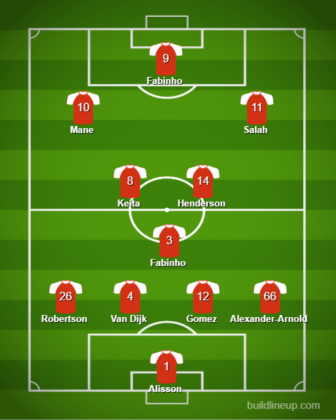 Liverpool: Alisson Becker, Trent Alexander-Arnold, Joe Gomez, Virgil Van Dijk, Andy Robertson, Fabinho, Jordan Henderson, Naby Keita, Mohamed Salah, Sadio Mane, Roberto Firmino.