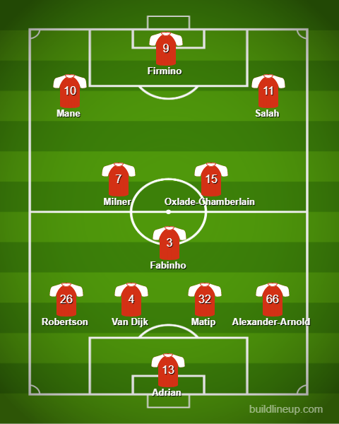Liverpool XI: Adrian, Trent Alexander-Arnold, Joel Matip, Virgil Van Dijk, Andy Robertson, Fabinho, James Milner, Alex Oxlade-Chamberlain, Mohamed Salah, Sadio Mane, Roberto Firmino.