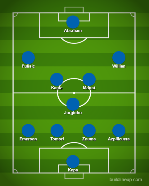 Chelsea XI (4-3-3): Kepa, Azpilicueta, Zouma, Tomori, Emerson; Kante, Jorginho, Mount; Willian, Abraham, Pulisic.