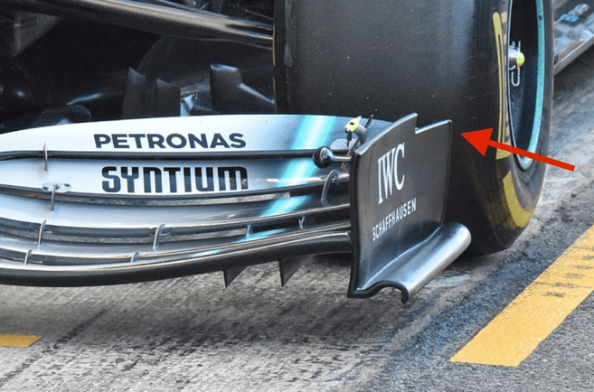 However with the new design, Mercedes have reverted to the outwash concept. The small cut out from the back corner also points to an attempt to create a vortex at an early point so together with the air flow coming off the wing flap it could be taken outside the edges of the car continuing the outwash effect. This also reduces the in wash and by default affects the loss of downforce that came from the in wash effect.