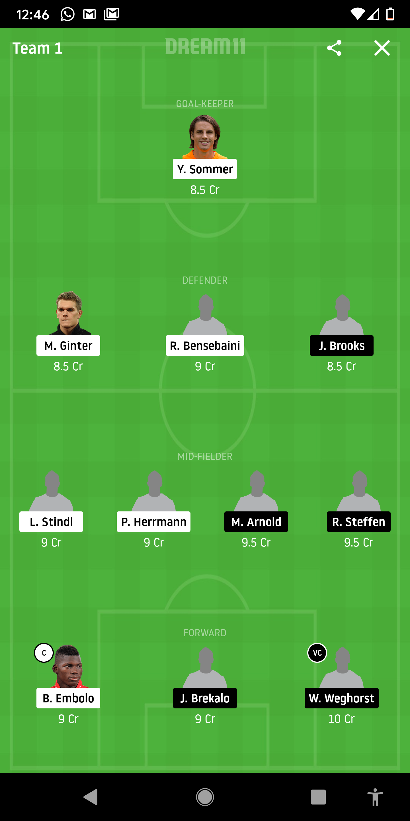 Lars Stindl will partner him up after he gave Bayern Munich a headache the last time around owing to his ability to transition the ball from defence to attack. With 6 goals, Renato Steffen will be our option from Wolfsburg with Maximillian Arnold partnering him up given his vast 4 goals and 8 assists.