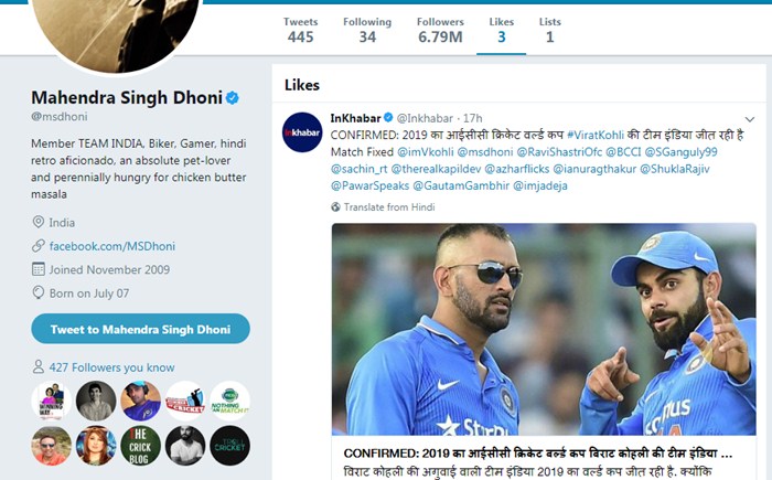 MS Dhoni who has a staggering fan following of 6.7 million followers to his Twitter account hardly active as he has tweeted only 45 times.