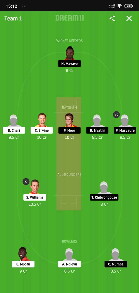 C.Mpofu (Price 9) and A.Ndlovu (Price 8.5) will be the bowlers from the Tuskers. Mpofu is a great bowler and has played on the International level too whereas Ndlovu has been decent in the tournament with the wickets and is bowling with a good economy too.