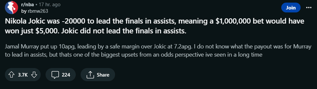 Redditor points out that bettors stood to gain close to nothing if they bet on Nikola Jokic leading the Playoffs in assists