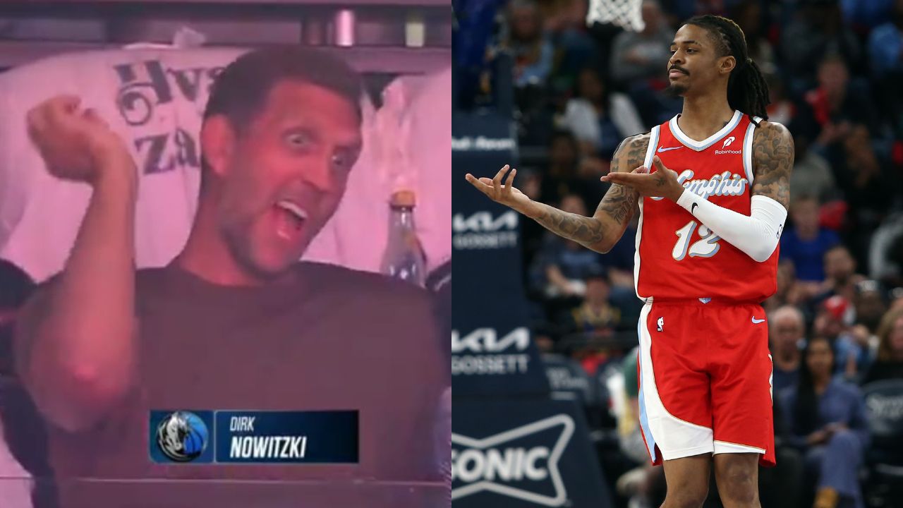 Nowitzki’s appearance isn’t a surprise. The 14-time All-Star also attended the first Lakers Game that Luka suited up for which was against the Utah Jazz. While tonight’s matchup had Mavericks GM Nico Harrison biting his nails, Dirk was having a grand old time watching the showdown. So much so that he seemingly mimicked Ja Morant’s controversial “hand grenade” gesture.