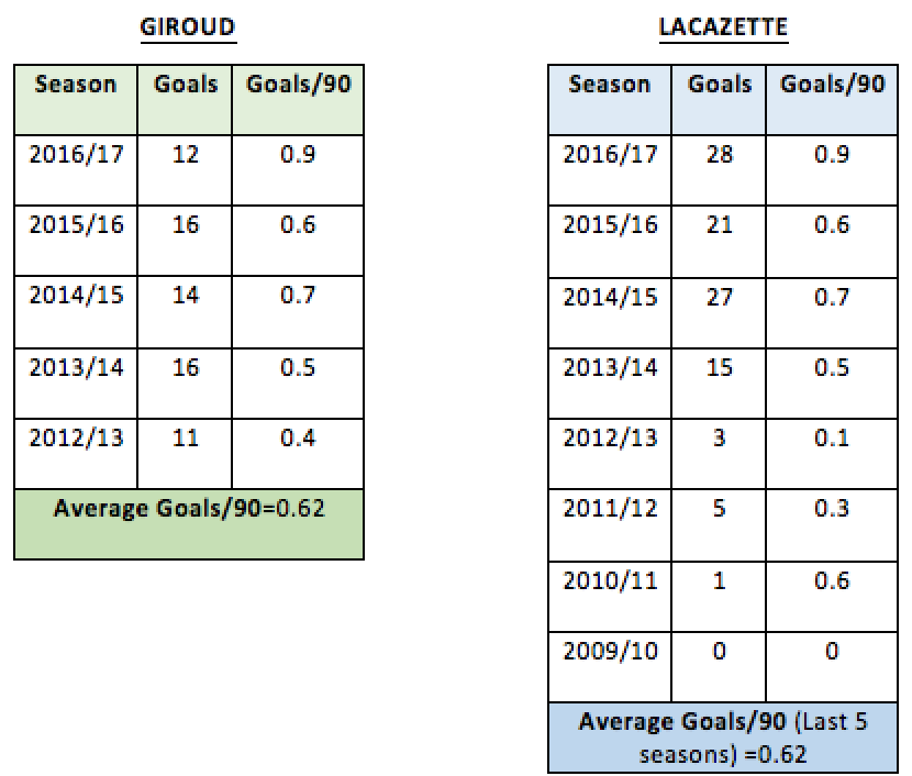 On comparison of last 5 seasons (since Giroud made his debut for Arsenal), both players have averaged 0.62 goals/90.
