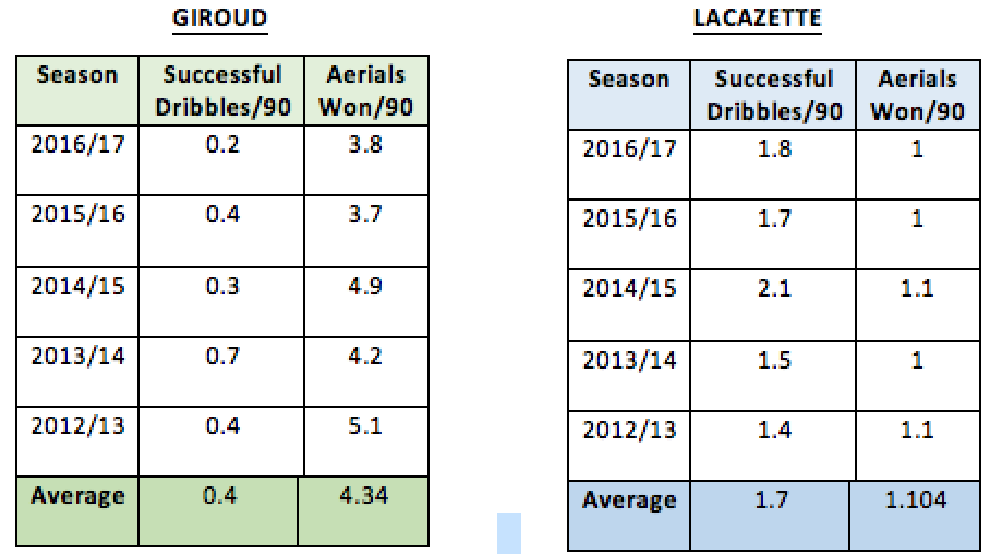 As per the numbers, Giroud is clearly a strong contender in the air, winning four times the aerial duels as Lacazette in the last five seasons of league football per 90 mins. On the other hand, Lacazette has completed four times the dribbles as Giroud per 90 mins in the same duration.