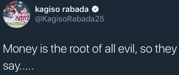 “Money is the root of all evil so, they say…” wrote Rabada, while Ngidi posted something similar, “Money is the root of ALL evil…” prompting cricket fans to become very suspicious.