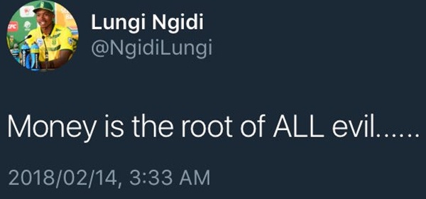 This comes after both Ngidi and Rabada sent out tweets in which they mentioned money is the root cause of all evil.
