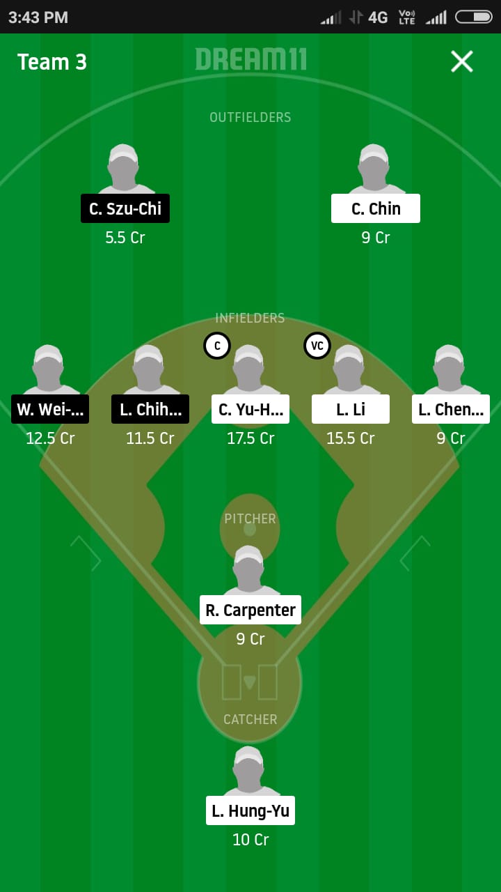 Rakuten’s L. Li, who is the second-costliest player in this match, is my Dream11 vice-captain for tomorrow. In the matches that L. Li has played so far, he has the maximum Runs batted in, Runs Scored and Hits Allowed and thus deserves to lead this side.