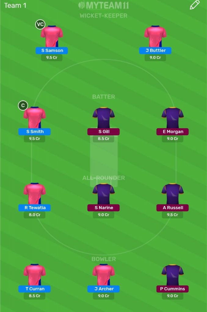 Butler, Samson, Morgan, Gill, Smith, Andre, Sunil, Tewatia, Cummins, Archer, Curran