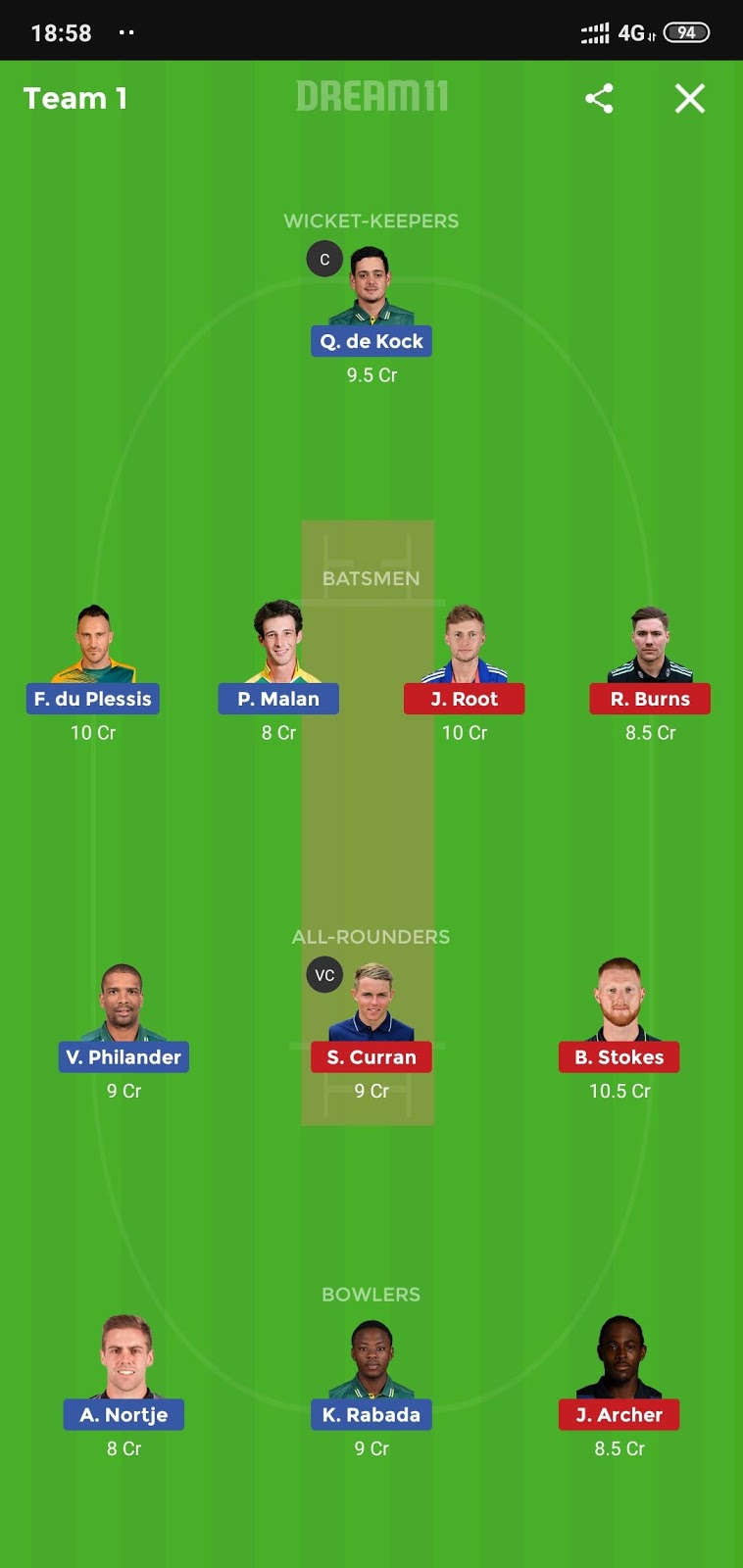 Quinton de Kock would be our captain as Newlands is his home ground and he is in good form whereas Sam Curran will be the vice-captain of our team.